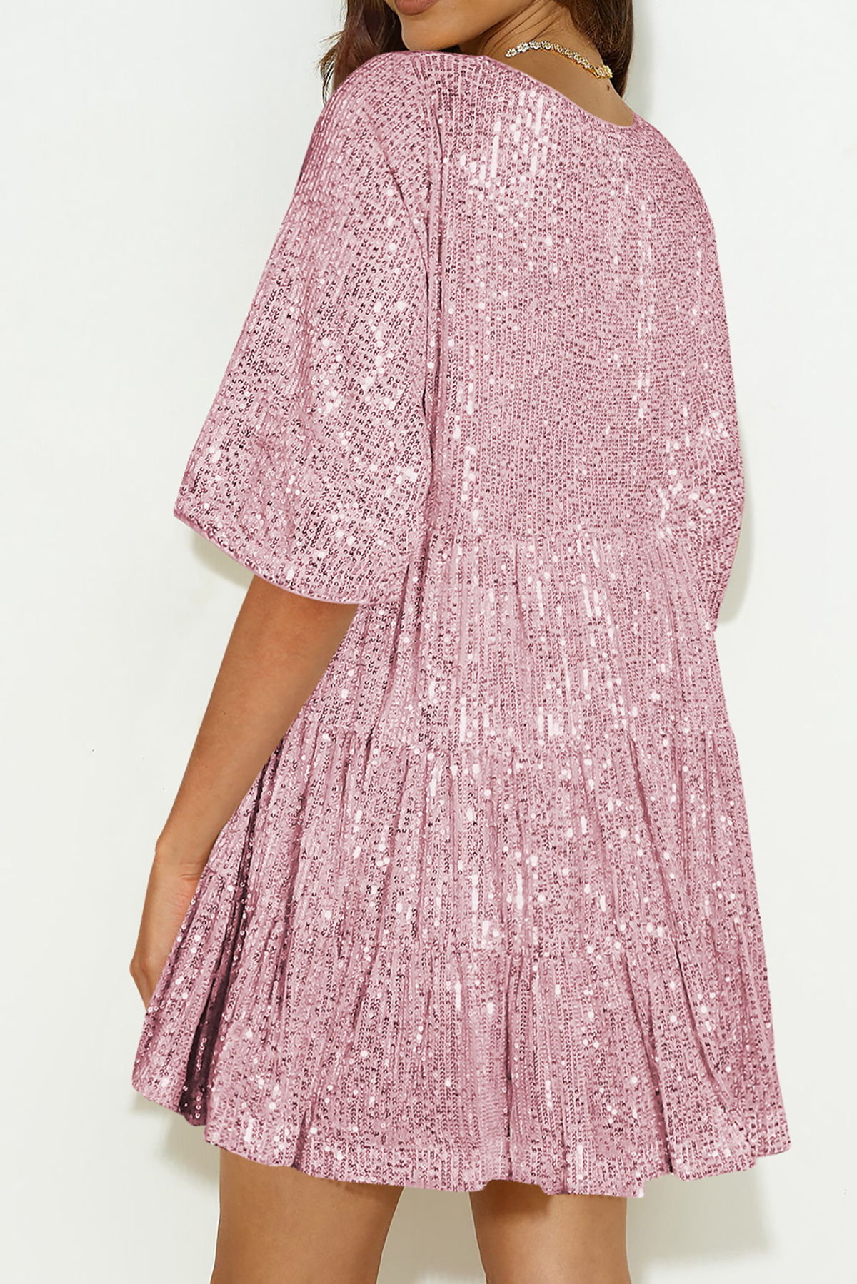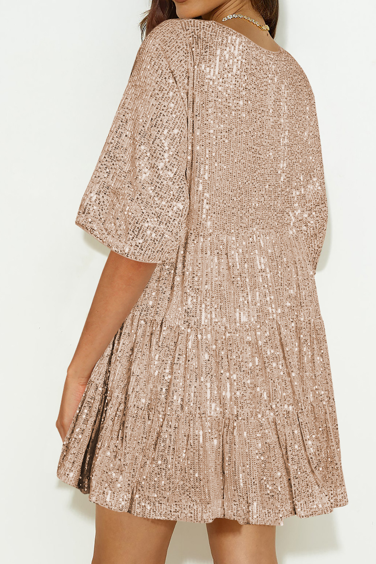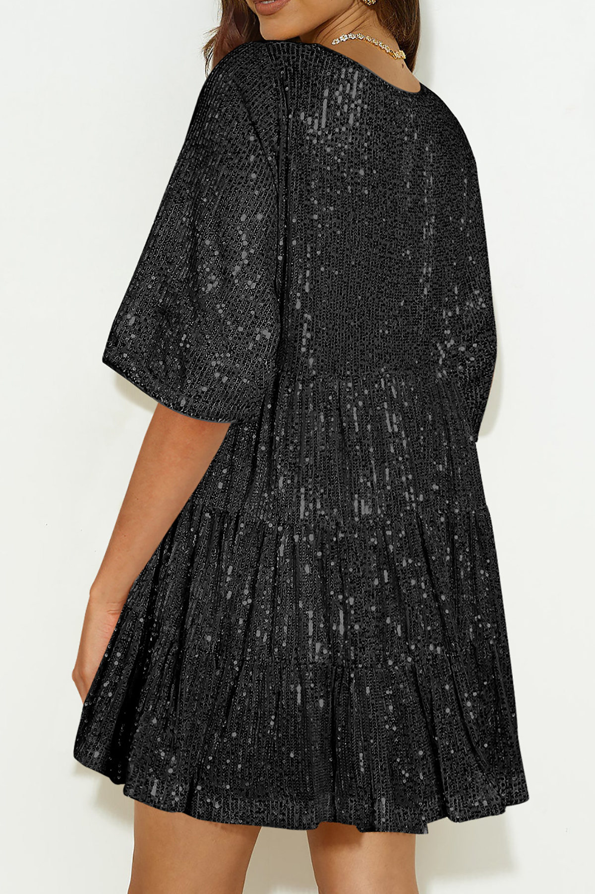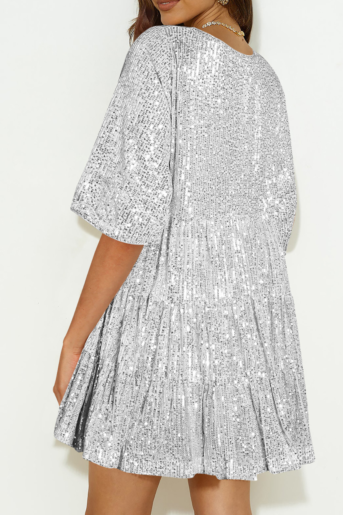 R.Vivimos Sparkly Sequin Babydoll Dress for Women 2025 Summer Short Sleeve Loose Tiered Swing Tunic Mini Dress Clubwear 5