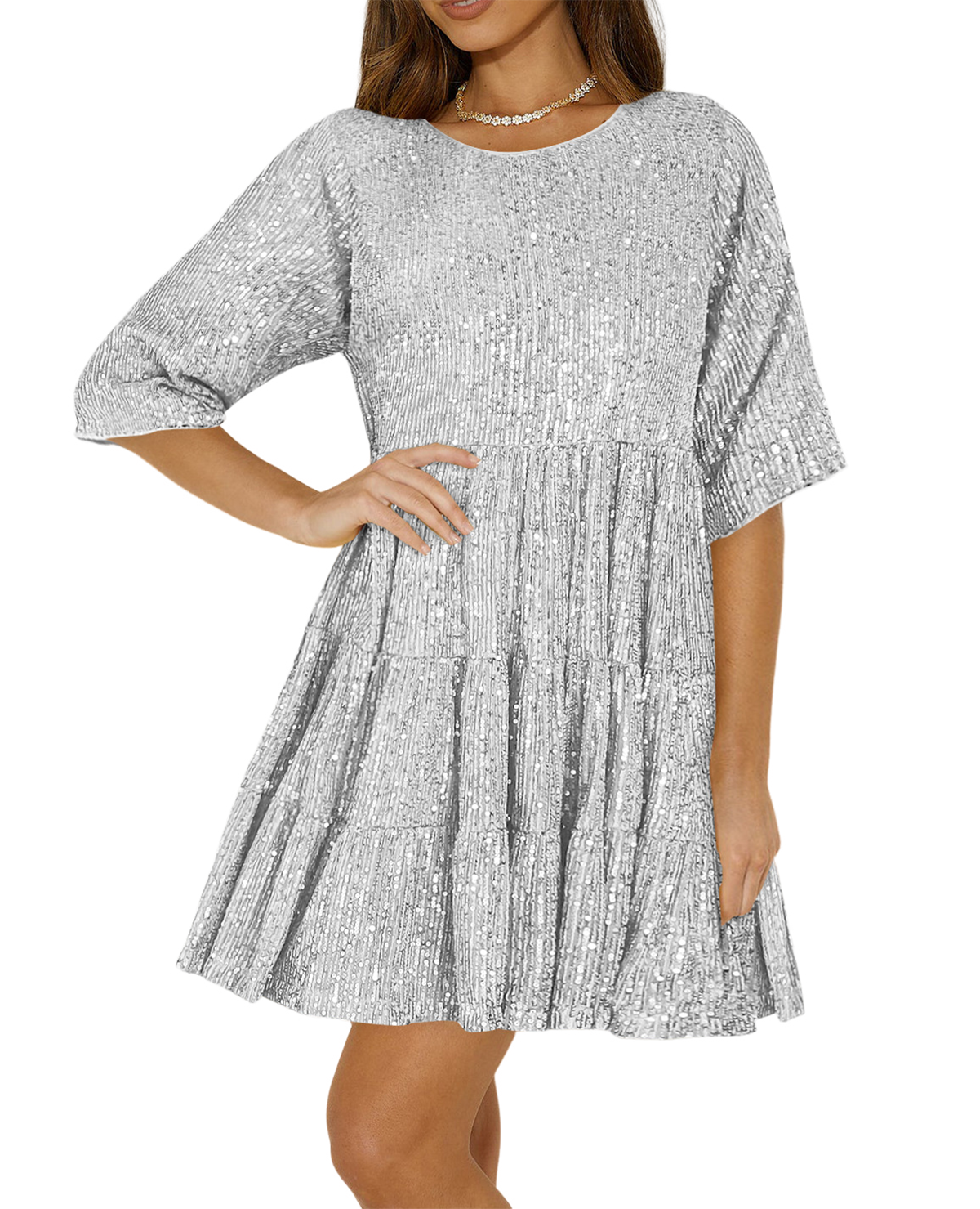 R.Vivimos Sparkly Sequin Babydoll Dress for Women 2025 Summer Short Sleeve Loose Tiered Swing Tunic Mini Dress Clubwear 15