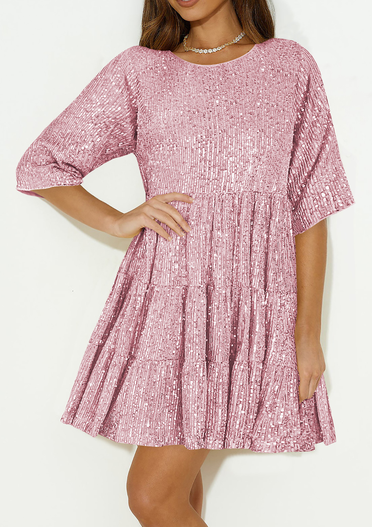 R.Vivimos Sparkly Sequin Babydoll Dress for Women 2025 Summer Short Sleeve Loose Tiered Swing Tunic Mini Dress Clubwear 17