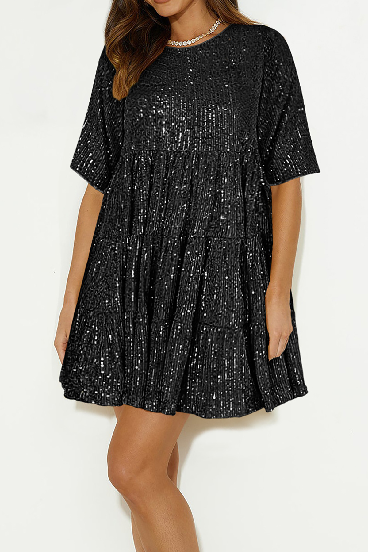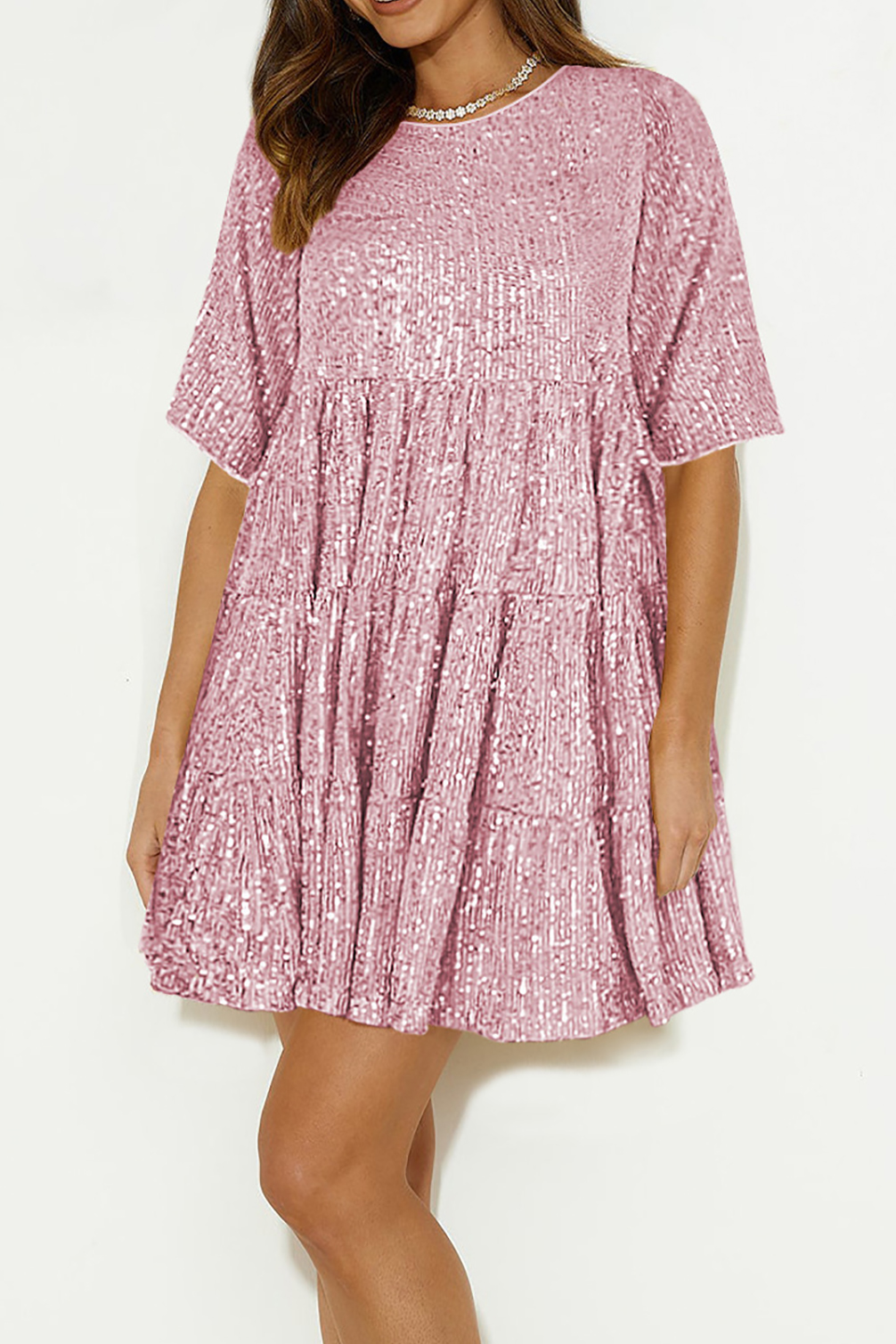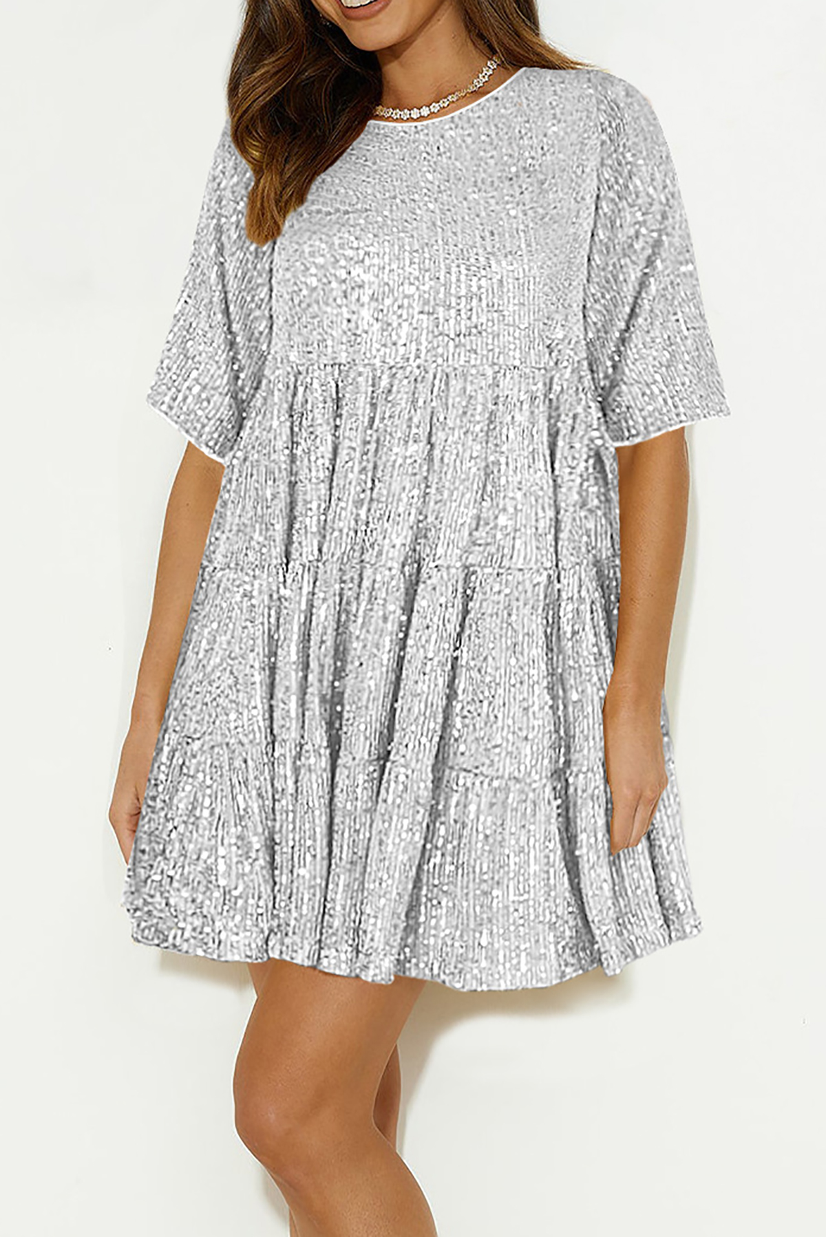 R.Vivimos Sparkly Sequin Babydoll Dress for Women 2025 Summer Short Sleeve Loose Tiered Swing Tunic Mini Dress Clubwear 2