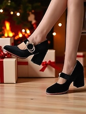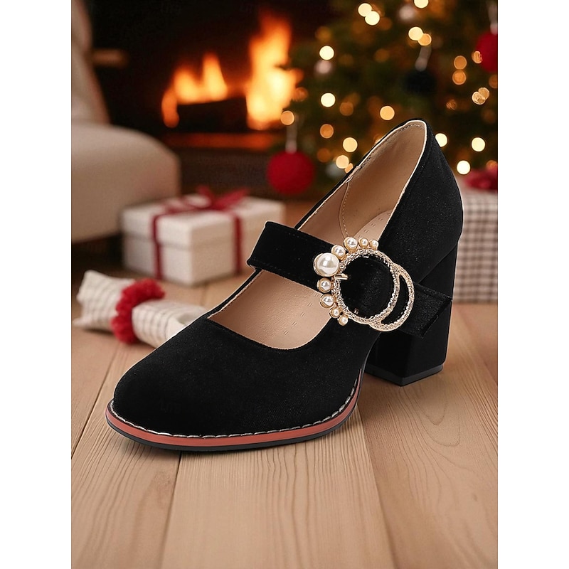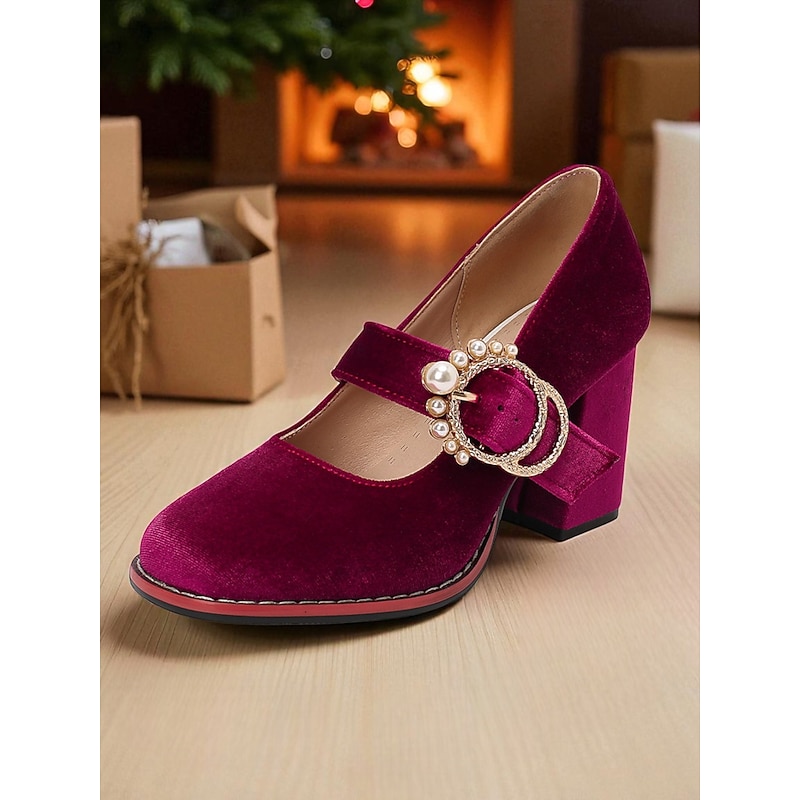 Highlights - Luxurious velvet upper materials - Sleek synthetic leather lining - Stylish buckle embellishment - Comfortable chunky heel - Classic round toe shape - Durable rubber outsole
