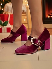 More information about Women's Green Velvet Mary Jane Heels with Chunky Block Heel and Pearl Buckle - 1950s Vintage Retro Dress Shoes for Ladies, Perfect for Christmas Parties, Weddings & Evening Events