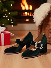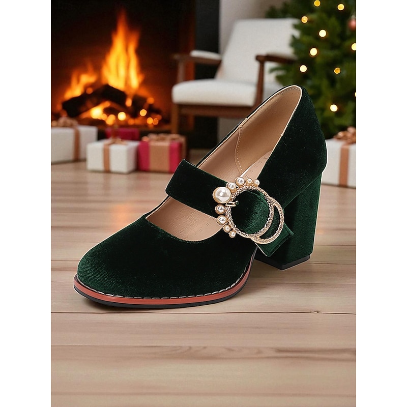 HOT ! Women's Green Velvet Mary Jane Heels with Chunky Block Heel and Pearl Buckle - 1950s Vintage Retro Dress Shoes for Ladies, Perfect for Christmas Parties, Weddings & Evening Events