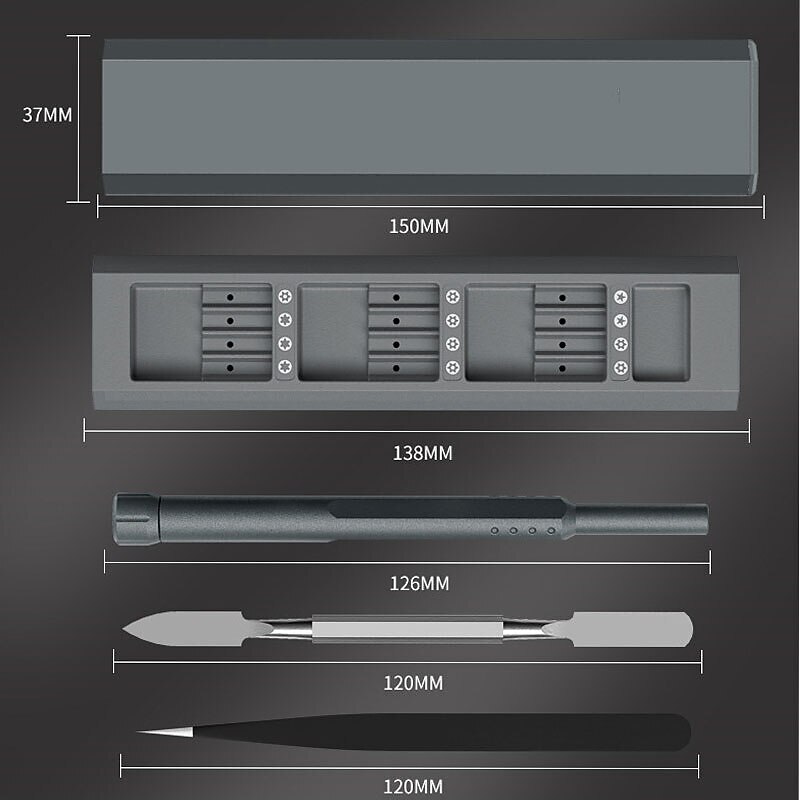 Highlights - Wide range of applications: This screwdriver set includes 44 different screw bits, suitable for repairing electronics, laptops, phones, PCs, watches, tablets, glasses, cameras, toys, and models. - High-quality material: The mini screwdrivers are made of high-quality S2 steel, which is stronger and more durable than CR-V alloy. The drill bit is magnetic, ensuring that the parts do not easily fall off during work. - Easy to use: The screwdriver set has an anti-slip handle that is comfortable to hold. All the sets come in a sleek metal box that feels super premium. Opening the box reveals neatly organized compartments secured with magnets. - Easy to carry: The precision screwdriver set is designed with storage space, making it convenient to carry in a tool bag or pocket. The placement of the screwdriver bits and the size of the accessories are consistent, ensuring that the parts do not fall out easily during your work.