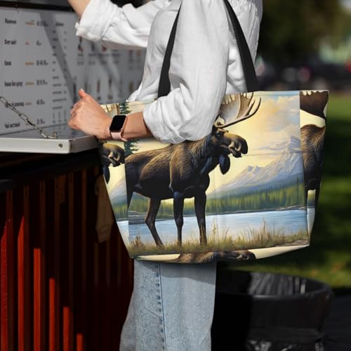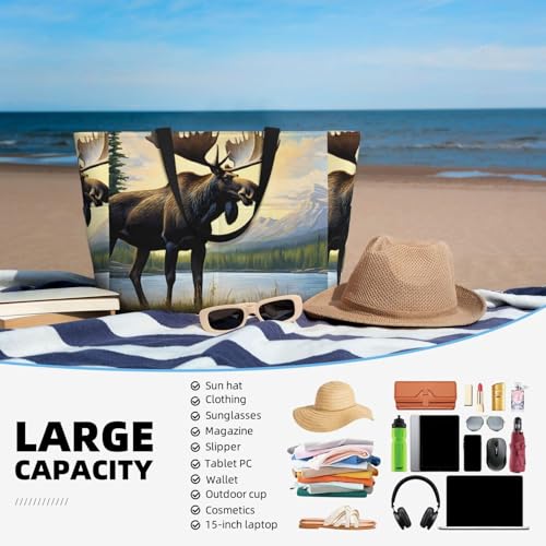 trending ! (Moose Cute Deer) Large Beach Tote Bag For Women With Zipper Foldable Lightweight Travel Pool Bag For Vacation Shopping