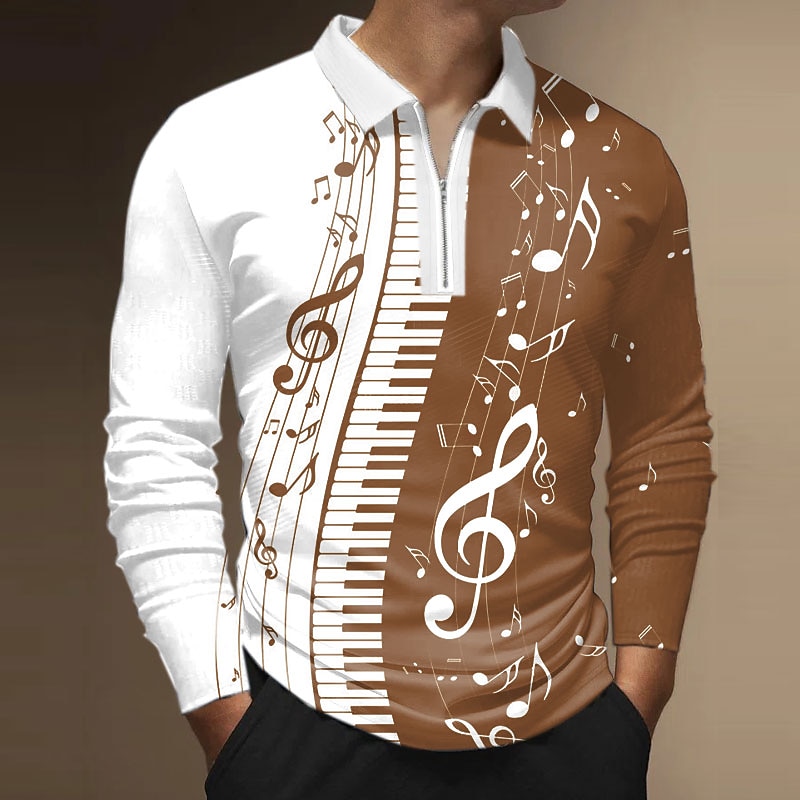 Featuring music-inspired 3D prints, this long-sleeve polo shirt showcases a unique blend of patterns, including a piano keyboard and musical notes, set against a backdrop of vibrant colors like blue, green, black, red, purple, and coffee. The quarter zip and classic collared neckline add sophistication and modern flair.