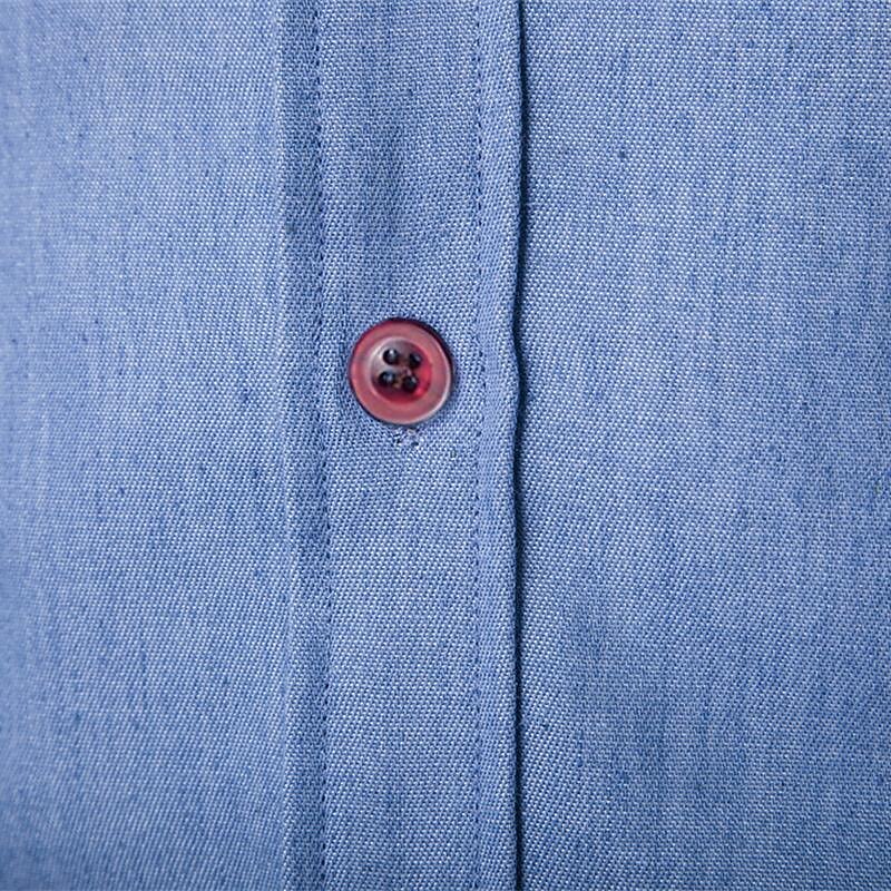 The shirt boasts a chic lapel neckline, adding a touch of elegance to its casual look. A contrasting front pocket with faux leather trim injects a contemporary flair into the overall design. Intriguing checkered fabric lines the interior of the collar, offering a delightful detail when worn unbuttoned. The contrasting red buttons serve as an eye-catching detail against the deep blue tones.