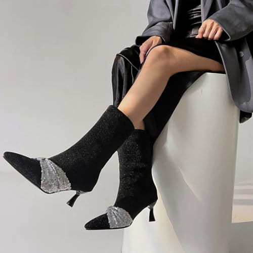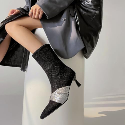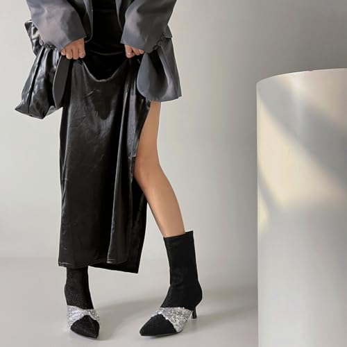 • ➤WOMENS ANKLE BOOTS MEASUREMENTS】: 2.75"Stiletto Kitten Heel Ankle Boots For Women; 9.45"Shaft Height from arch; Boot Opening 10.63"around; JOEUSTY Women's Pointed Toe Kitten Low Heels Ankle Boots Glitter Sequins Pull On Elegant Bowtie Dressy Short Booties.