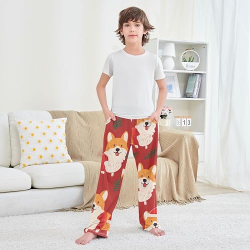 HOT ! Christmas Corgi Pine Branches Boys Long Pants Soft Trousers Elastic Waist Kids Lounge Bottoms with Pockets S-XL