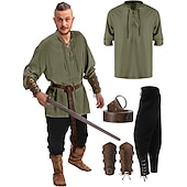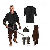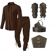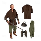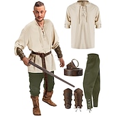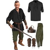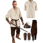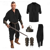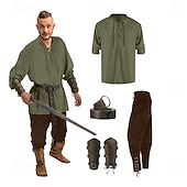 : Crafted from a blend of linen, cotton, and polyester, these costumes offer breathable comfort and durability, making them suitable for extended wear. The costumes are designed with a retro vintage aesthetic, combining elements of medieval, renaissance, and Viking styles for an authentic and rugged look.