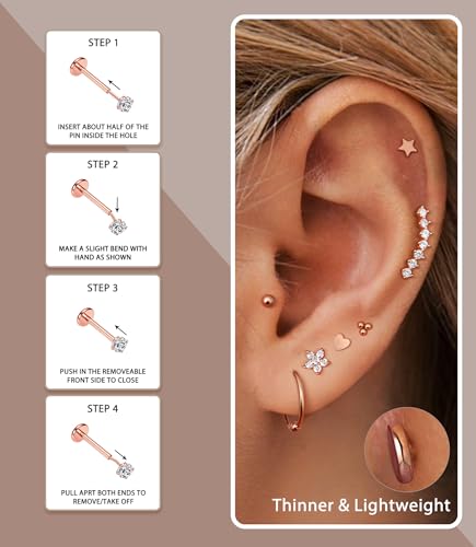 • Affordable Set: You’ll receive 8 cartilage hoop earrings, 7 cartilage stud earrings, 2 twisted spiral barbells, 4 threadless flat back earrings, and 6 cubic zirconia stones. These pieces can be used individually or mixed and matched for custom looks. Just enjoy the fun of DIY with your piercing jewelry!