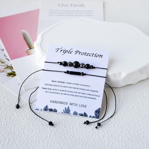 HOT ! 2Pcs Triple Protection Bracelets Black Tourmaline and Obsidian Bracelets Natural Stone Jewelry for Women Men Gifts for Him Her