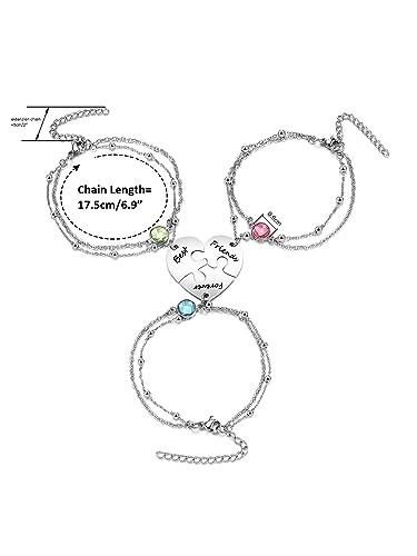 Material: Stainless SteelMetal type: Stainless SteelChain type: Link ChainGem type: No gemstone【Friendship Puzzle Bracelet】: Engraved with the words: Best Friends Forever. This friend bracelet is a complete heart shape when put together. It becomes a bond for you to miss each other and will make your good friends and family members feel special.【BFF Bracelets Material & Size】: This bff bracelet is made of high-quality stainless steel and coating technology. Not easy to corrode, fade, durable, smooth and polished surface. More comfortable to wear. Length: 6.9+2. Package: 3pcs BFF Bracelet.【3 Friendship Bracelets】: 3 bracelets put together to form a heart. It symbolizes the inseparable love between you and your family, friends, or other important people, and also implies that this love is complete. Even if it's a short separation sometimes, But the exquisite love that belongs to you is always connected.【Long distance bracelet】: When you wear this friendship bracelet with your best friends, you can feel each other's company no matter how far apart you are. Bosom friends despite geographical distance, seemed to close at hand. Your paths may change as life goes on, but the bond between you remains forever strong.【Perfect Gift】: These unique puzzle piece sister bracelets for 3 is very suitable as a gift to others or yourself. Suitable for any gift-giving occasion. For example, Christmas, birthday, Valentine's Day, wedding, anniversary, mother's day, etc. There are also many audiences, Such as gifts to good friends, lovers, family or colleagues, and club members. This stylish custom necklace will be a very nice gift. Perfect for everyday use. superior materials and excellent craftsmanship ensure long-lasting durability.