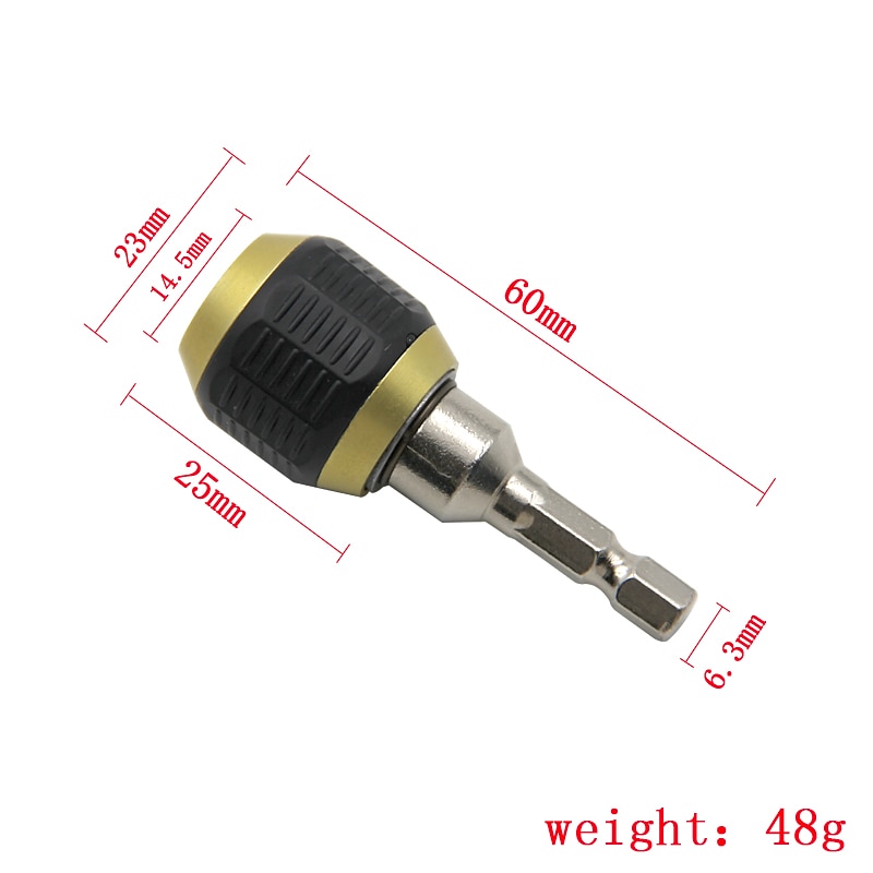 Highlights Electric drills are troublesome to change bits. The use of Quick-release Hexagon Drill Bit Coupling can eject the bit in one second, which greatly improves efficiency and saves time. It has a built-in stability lock and high-efficiency spring which clamp the bits firmly for stable drilling without shaking. MAIN FEATURES Quick Release Bit Holder The interface has a locking mechanism for one-handed quick release. Press down can release the ejection bit, realizing quick replacement in one second. Improve Work Efficiency Quick-release design allows you to quickly install, lock and unlock the bit easily, greatly improving work efficiency. Durable & Stable Made of premium Alloy Steel for high strength and hardness, non-slip, large torque, durable for a long time. Widely Used Hex shank can fit power drills chuck, impact drills, electric drills, and hand drills. Used for screwdriver bits, drill bits, batch head, sleeve, and other tools for the conversion and extension. SPECIFICATIONS Material: Alloy Steel Size: 60mm Weight: 47g Hex Shank Interface: 6.35mm/ 1/4” Hex Socket Interface: 6.35mm/ 1/4” Package Includes: 1x Quick-release Hexagon Drill Bit Coupling