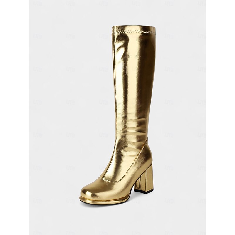 HOT ! Women's 1980s Disco Metallic Gold Knee-High Platform Go Go Boots, Y2K-Inspired Block Heel Boots for Parties, Festivals & Concerts.