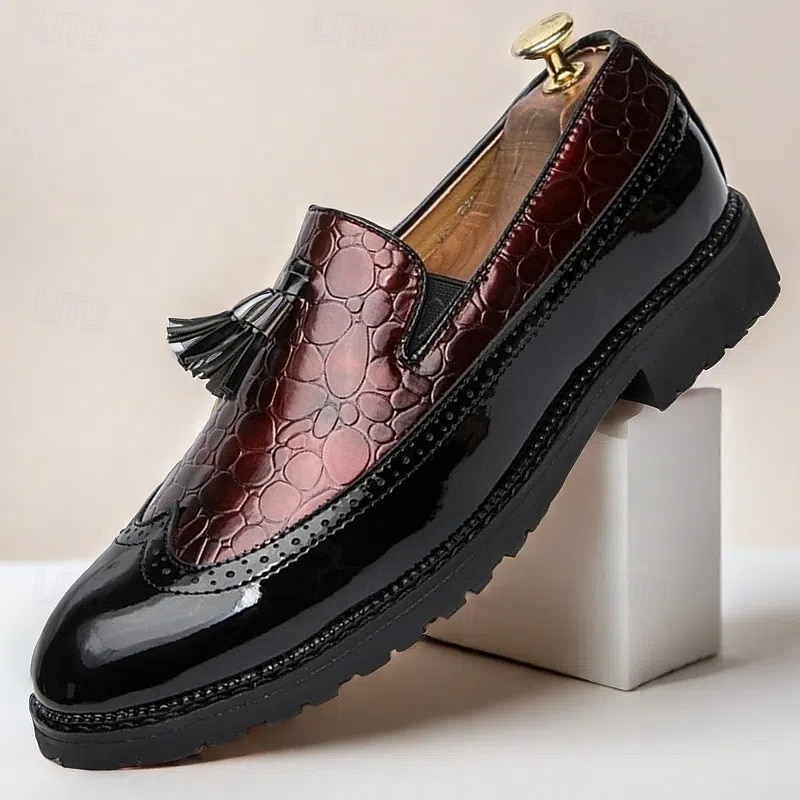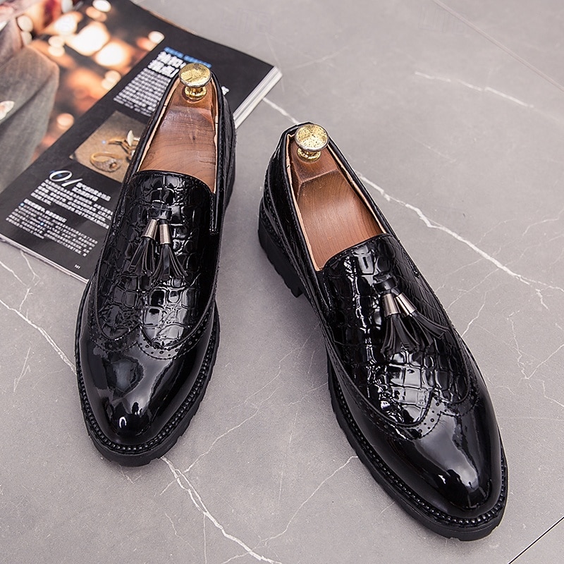 Highlights [Fabric] These modern loafers are crafted from high-quality PU leather, combining both black and white elements for a sophisticated appearance. The luxurious glossy finish of the PU leather upper perfectly imitates a crocodile skin pattern, adding a touch of exotic flair. [Pattern] Designed with a sleek, slip-on silhouette, these loafers feature a round toe shape that enhances comfort and modern elegance. The loafers are complemented by chic tassel details, providing a classic yet contemporary look suitable for various formal settings. [Design Highlights] A standout feature of these loafers is the elegant tassel embellishment, which adds classic charm to the overall design. The loafers also boast a sturdy rubber outsole that ensures slip resistance and durability, making them ideal for long-term wear. [Occasions] Perfect for weddings, business meetings, and other formal or semi-formal occasions, these loafers offer a blend of refinement and modern style. The contrast between the black and white patent faux leather, along with the rare crocodile pattern, makes these shoes a versatile addition to any sophisticated wardrobe. [Size] Available in a range of men's sizes from US6-11.5 / EU38-45 / UK5-10.5, these loafers cater to a broad spectrum of foot sizes, ensuring a perfect fit for various customers.