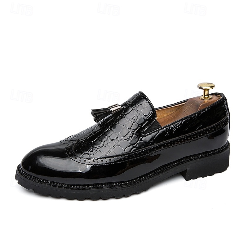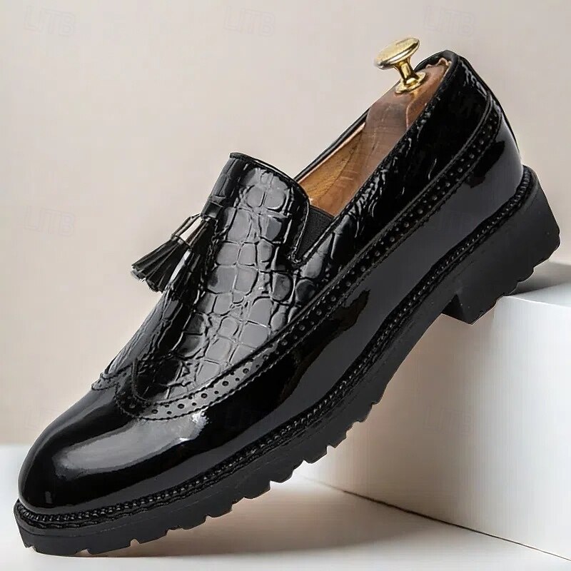 trending ! Men's Black and White Patent Faux Leather Loafers – Crocodile Embossed Tassel Dress Shoes with Chunky Sole for Gatsby Party, Wedding, Prom, Refined Nightlife