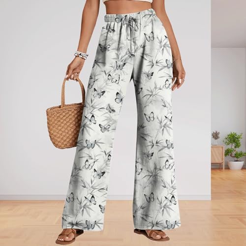 HOT ! Womens Butterfly Print Pants Summer Casual Drawstring Waist Pants Floral Dragonfly Graphic Trousers Lightweight