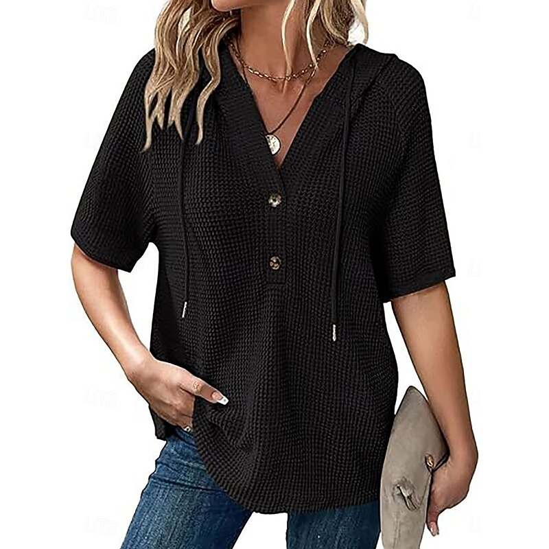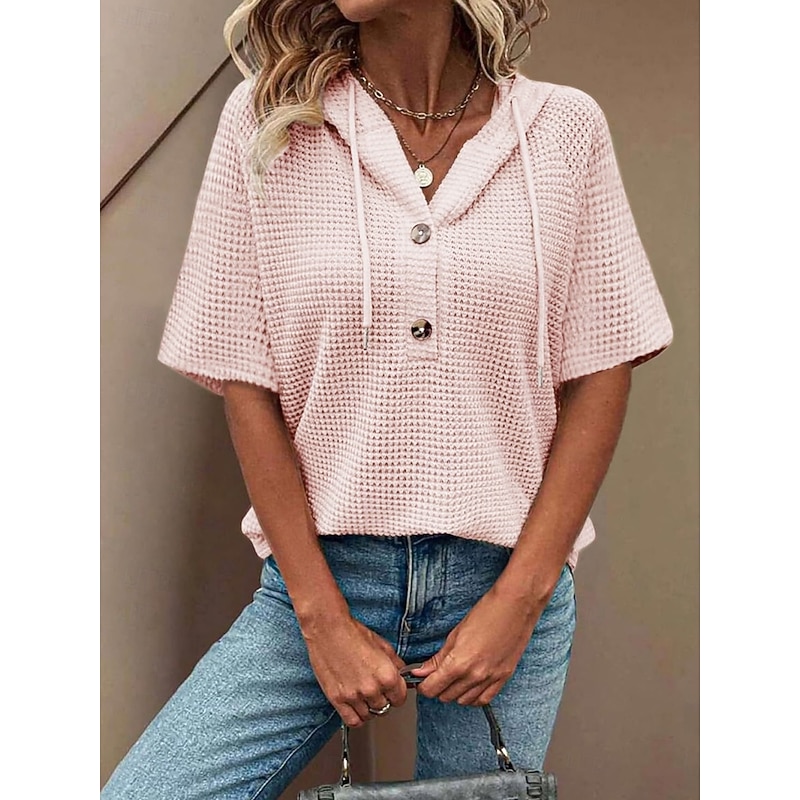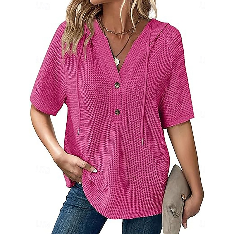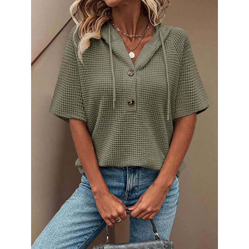 Highlights - Perfect for summer with a lightweight waffle fabric - Short sleeves for a breezy and comfortable fit - Designed for women with a basic, versatile style - Ideal for daily wear with a V-neck and button detailing - Stay cool and stylish in this trendy summer essential