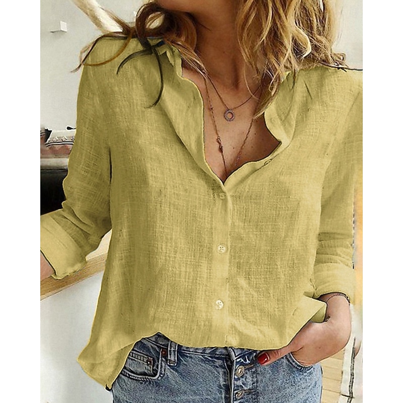 HOT ! Women's Shirt Cotton Linen Shirts Button Up Blouse Solid Color Basic Casual Long Sleeve Shirt Collar Regular Tops Daily Buttons Yellow Green Summer Spring