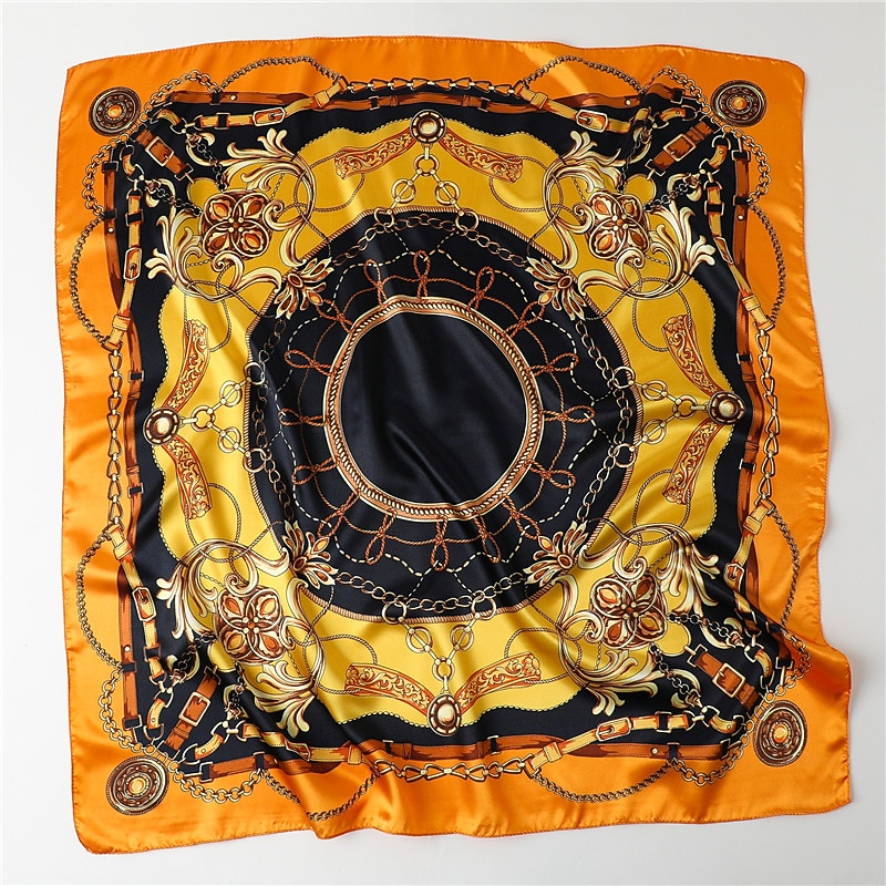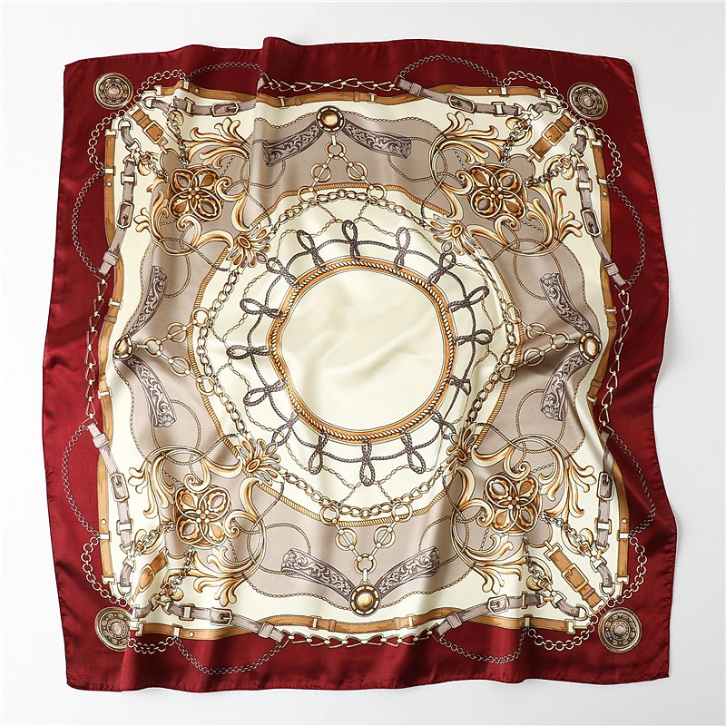 Highlights [Fabric] Crafted from luxurious satin, this scarf provides a smooth and gentle sheen reminiscent of high-quality silk, ensuring a sophisticated and comfortable wear. [Design & Style] Featuring a striking chain print, this scarf encompasses a rich mix of deep teal, red, brown, and gold hues. Its intricate patterns of chains and medallions make it an eye-catching and versatile accessory, perfect for adding a touch of elegance to any outfit. [Design Highlights] The scarf's generous 90*90cm size allows for versatile styling options. Whether worn as a stylish headscarf or draped effortlessly around the neck, its lightweight fabric ensures comfort and ease of wear throughout the day. [Occasions] Ideal for various settings, this scarf seamlessly transitions from beach outings to boho-themed gatherings, and is equally suitable for parties, evening events, holidays, or daily use. Its vibrant design adds a splash of charm and sophistication to any occasion. [Size & Fit] Offered in one size, this scarf is designed to suit a wide range of styling possibilities, accommodating different ways of wear for your unique style needs.
