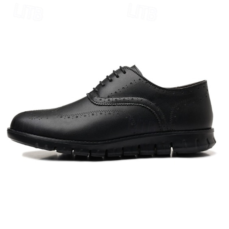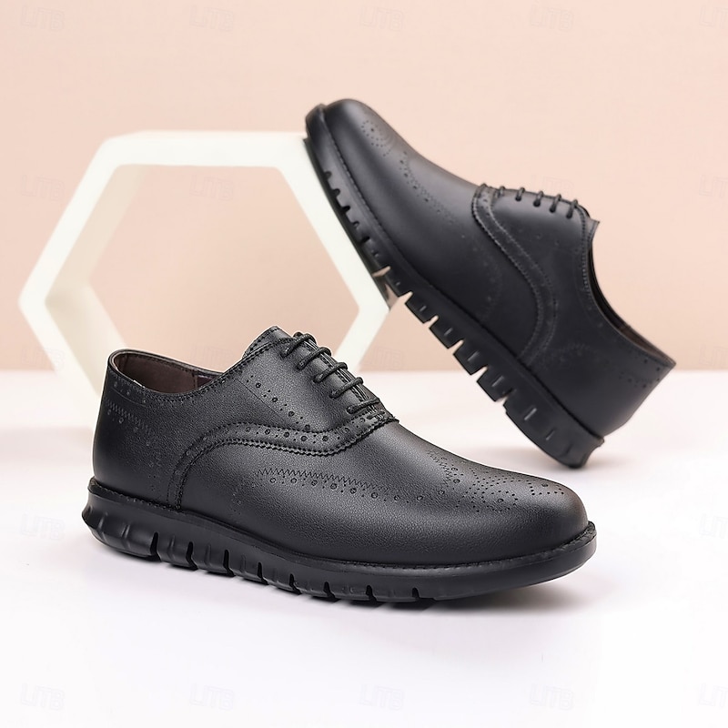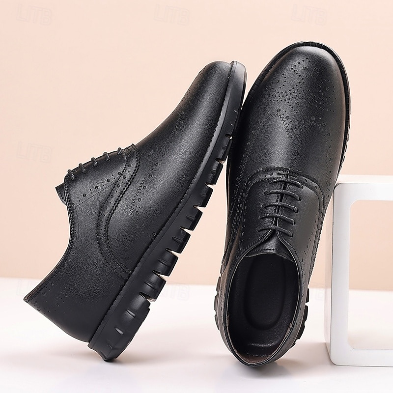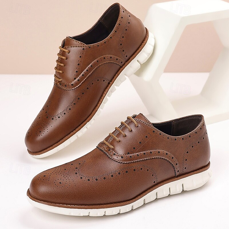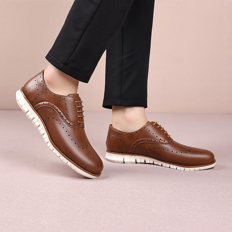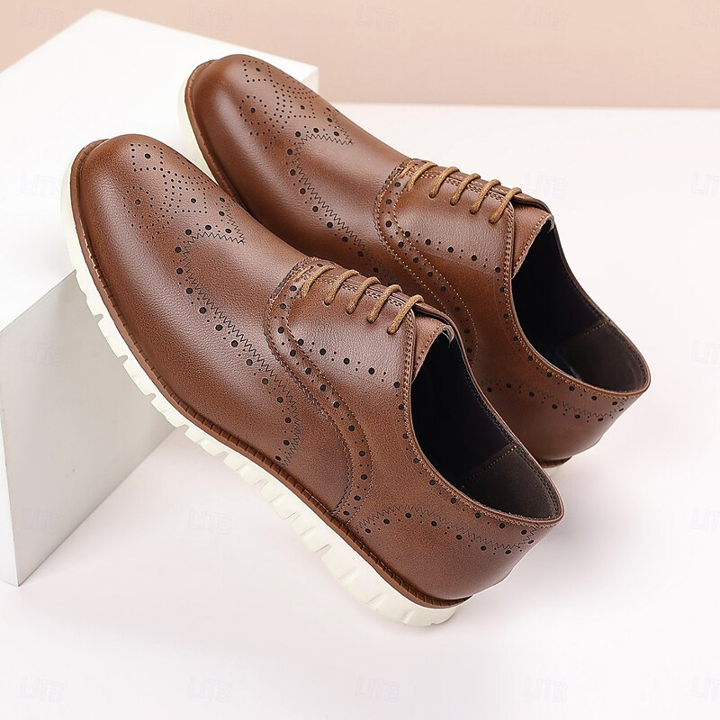 HOT ! Men's Brown Faux Leather Oxford Shoes – Breathable Lace-Up Dress Shoes with Perforated Detailing for Office and Formal Events