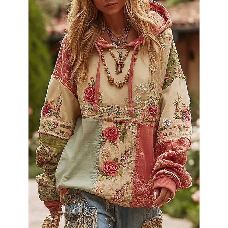Women's 3D Print Vintage Boho Hoodie Patchwork Hoodie Sweatshirt Floral Pullover Sweatshirt Oversized Casual Warm Active Hooded Street Dailywear Patchwork Pink Spring Fall Winter 3