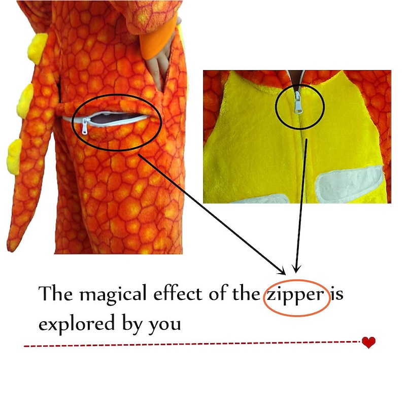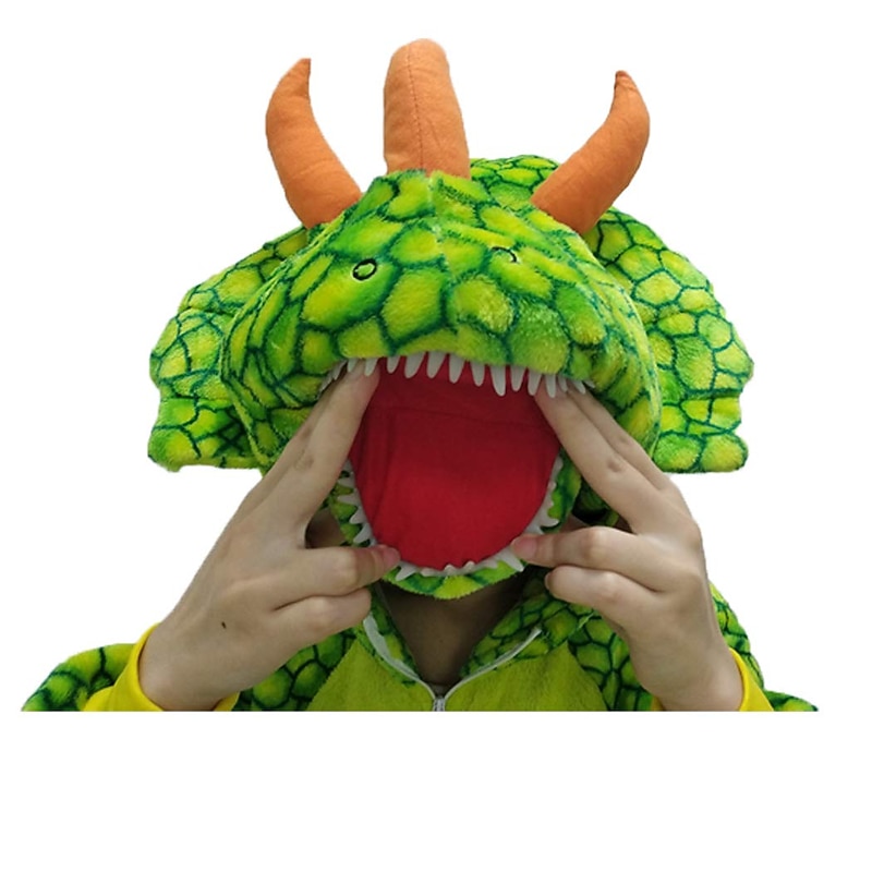 This eye-catching onesie features a whimsical dinosaur design complete with a hood that mimics a dinosaur head, adorned with playful spikes and charming facial details. The vibrant animal-themed pattern includes a dynamic green color with colorful scale-like speckles, and a standout yellow belly with white accents.