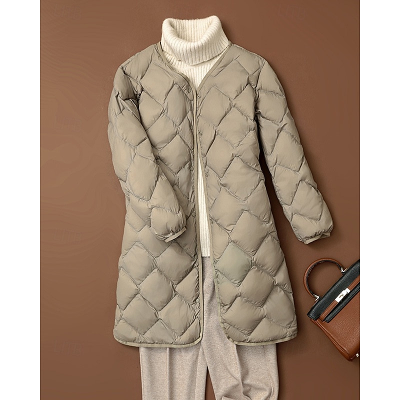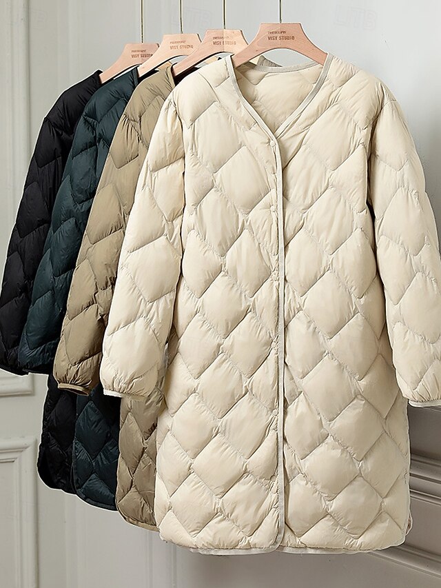 Women's Down Jacket Coat Warm Comfortable Buttons Fashion Plain Outdoor Vacation Going out Weekend Single Breasted Long V Neck Regular Fit Long Sleeve Outerwear Black Dark Green Khaki Fall Winter 16