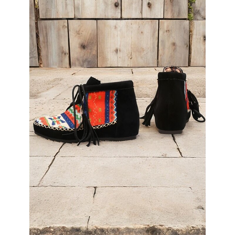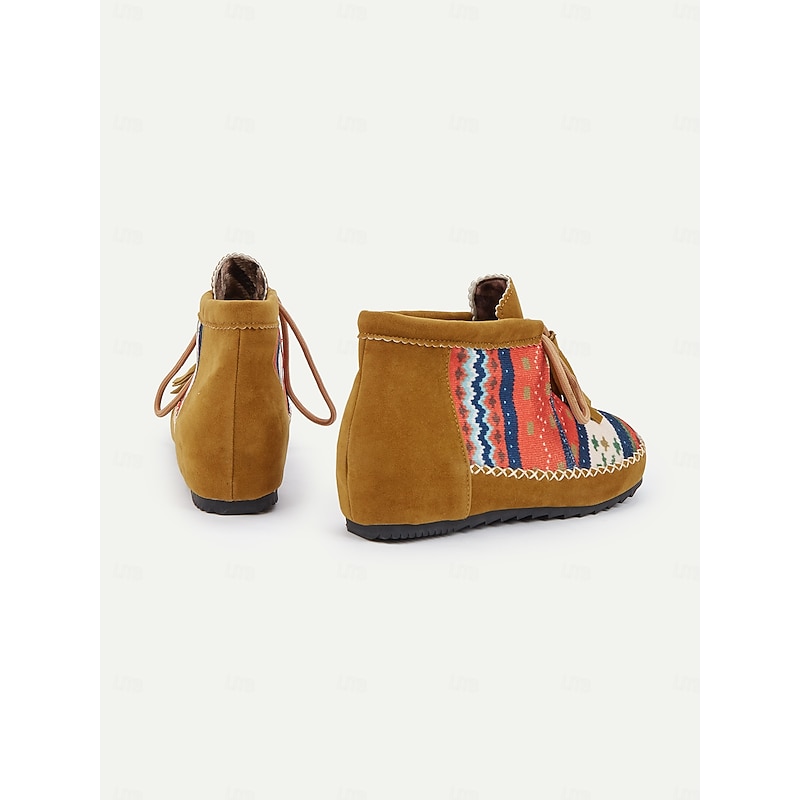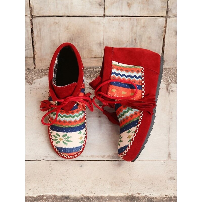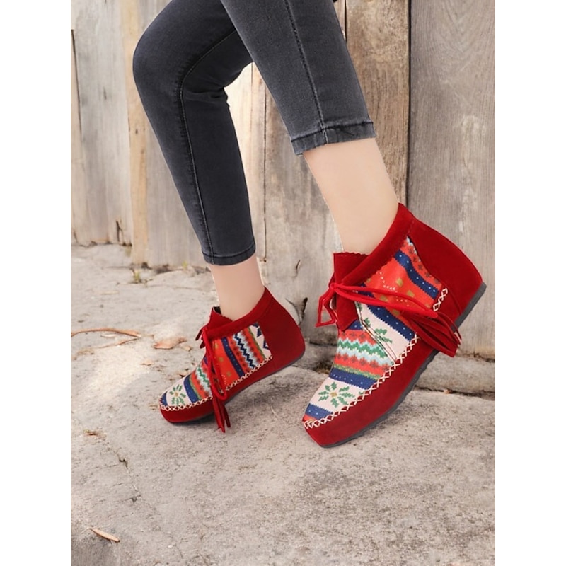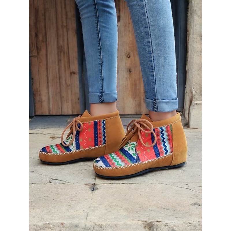 : Designed with an upper part featuring faux suede and colorful cloth, these women's ankle boots highlight a Southwestern-inspired woven fabric in vibrant shades of red, blue, and green. The lining is made of soft textile, ensuring both comfort and breathability for every wear.