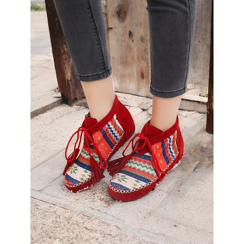 Women's Boho Ankle Boots with Ethnic Print Panels, Tassel Lace-Up Design, and Comfortable Low Sole – Perfect for Casual and Festival Wear