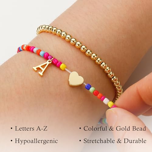 Ritach Colorful Initial Bracelets for Girls Women - Real Gold Plated Stretchable Beaded Bracelets Cute Heart Initial Bracelets for Girls Stackable Bracelets for Women Teen Girl Gifts 4