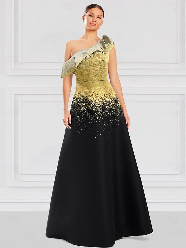 Black and Gold Ombre Jacquard A-Line Evening Gown Elegant Dress Formal Wedding Floor Length Sleeveless Off Shoulder with Ruffles 1