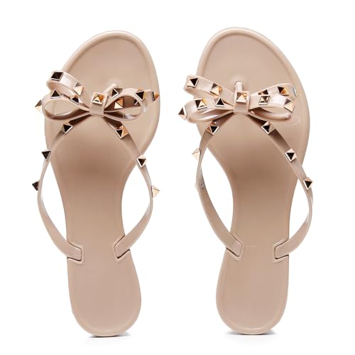 Womens Studded Sandals Flat Jelly Shoes Thong Flip Flops with Bow Stud Slip On Summer Beach Rivets Dressy Slides 7