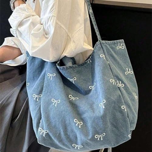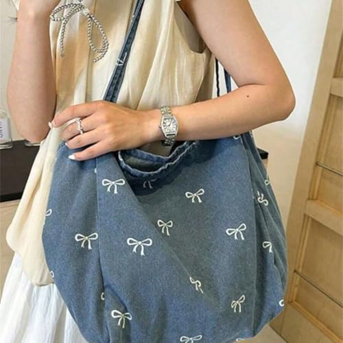 More information about Chic Denim Bow Handbag - Kawaii Vintage Message Bag for Women, Large Capacity Casual Shoulder Bag, Perfect Travel