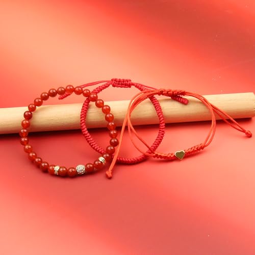 3Pcs Red Bracelets for Women – Carnelian & Red String Heart Bracelet Set Handmade Adjustable Lucky Protection Tibetan Talisman Jewelry 3