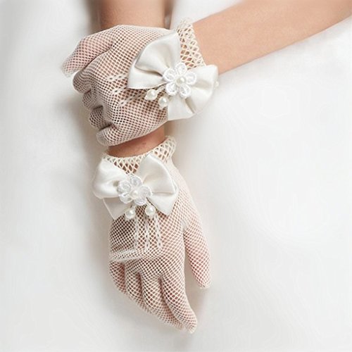 DreamHigh Wedding Flower Girls Mittens Pearl Bow Tie Fish Net Gloves- White 1