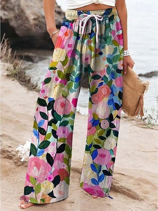 Women's Wide Leg Chinos Baggy Pants Vacation Fashion Hawaiian Full Length High Waist Floral Graphic Drawstring Printing Soft Breathable Micro-elastic Vacation Street Causal Violet off-white Deep Blue 6