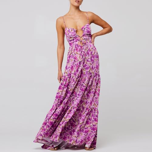 • Design: Summer woman elegant maxi dress is features for unique flower print, low cut neck, spaghetti straps and tie up front, hollow out back and elastic back, A-line, ruffled loose layered hem