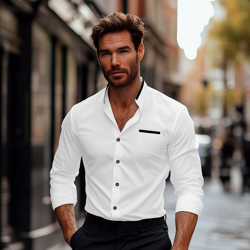HOT ! Men's Shirt Band Collar Shirt Dress Shirt Button Up Shirt Oxford Shirt Patchwork Wedding Vacation White Navy Blue Blue Gray Long Sleeve Standing Collar Spring & Summer Clothing Apparel Front Pocket