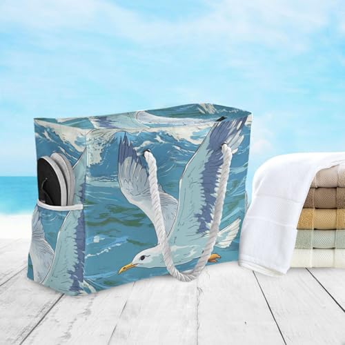 Seagull Flying over The Ocean Waves Sturdy Pocket Tote Bag with side pocketes Weekender Travel Bag for Pool Gym Grocery Travel 7