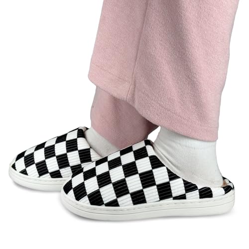Checkered Memory Foam Slippers - Women's & Men's Soft Warm Bedroom House Slippers with Faux Fur Lining - Indoor/Outdoor - Pink, White, Black - Size 8/9 5