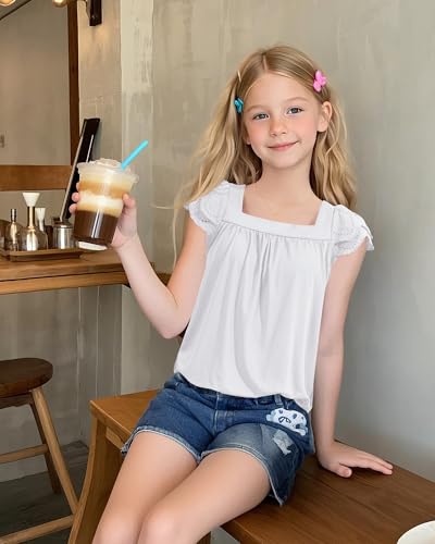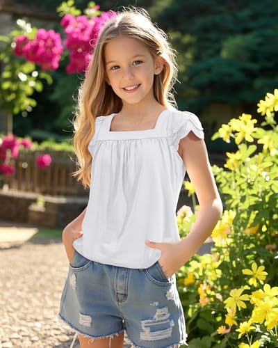 KEREDA Girls Short Sleeve Shirts Summer Tunic Tops Lace Openwork Ruffled Girls Cute Square Neck Clothes Blouse 5-14 Years 4