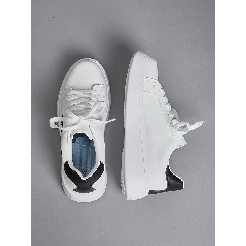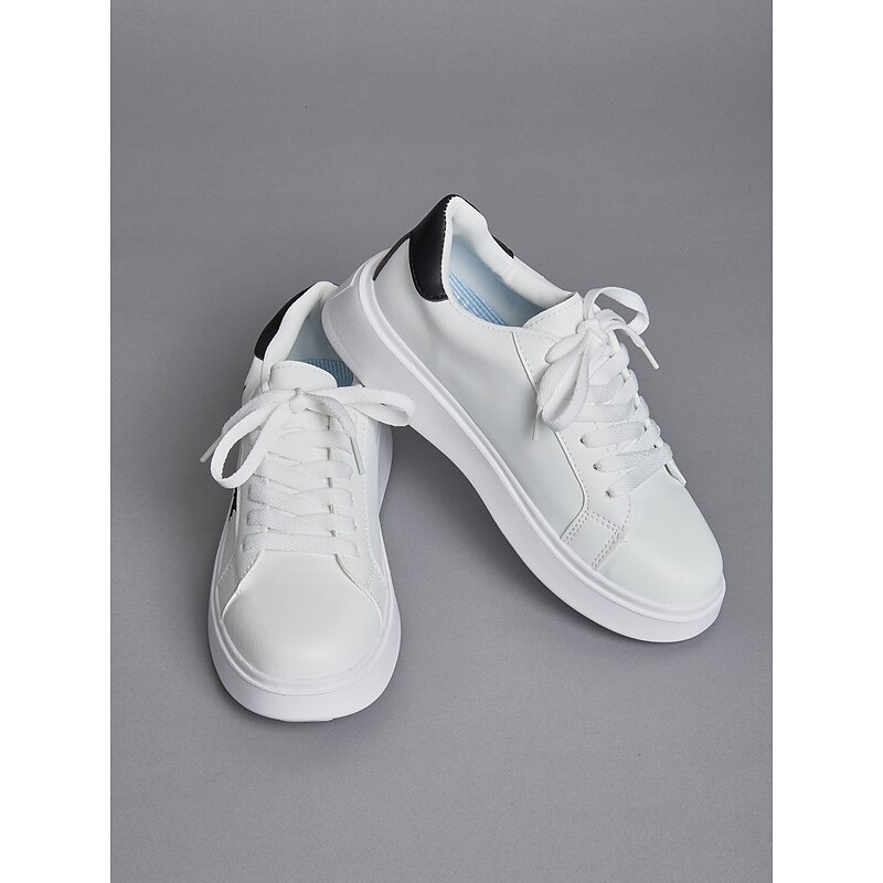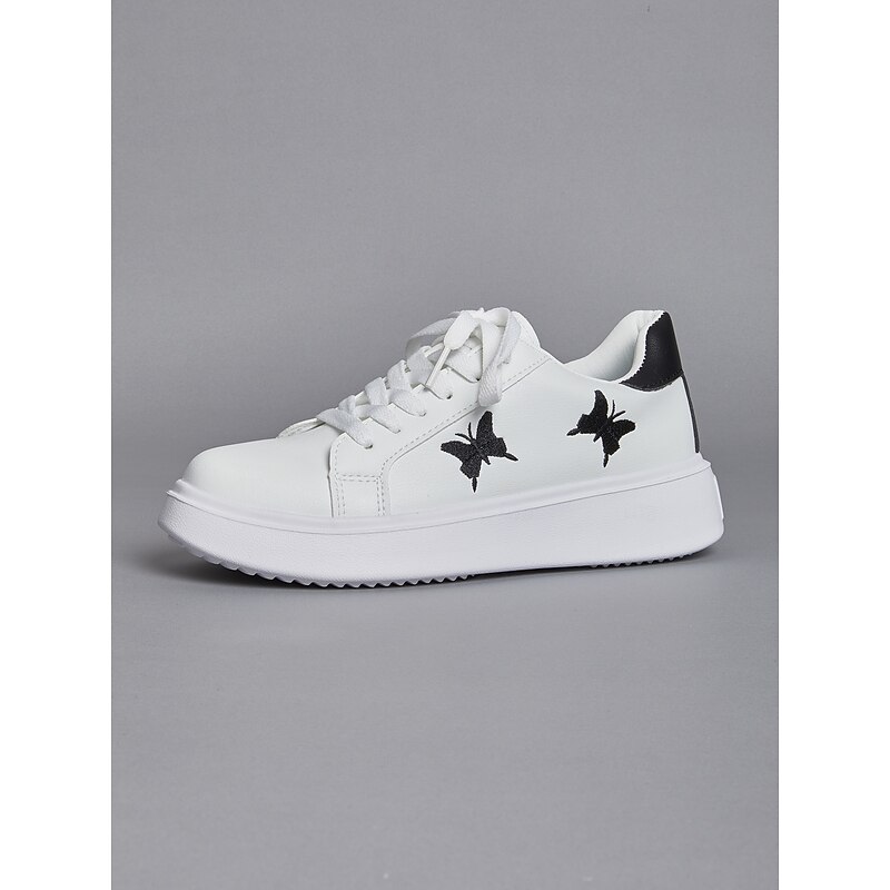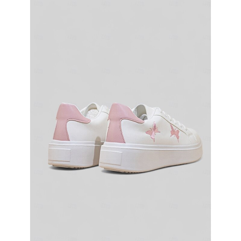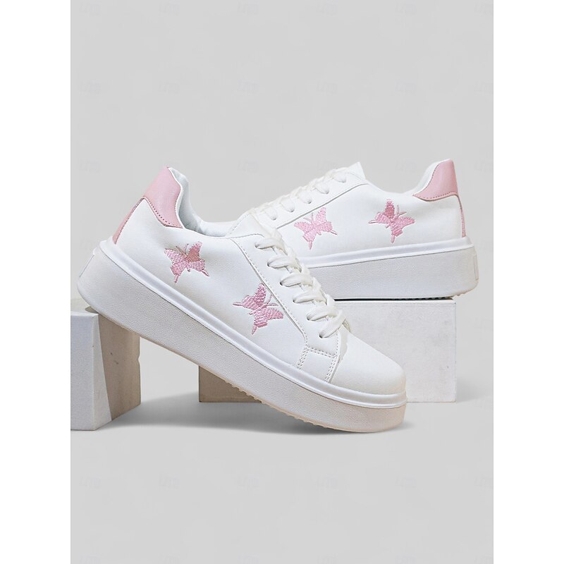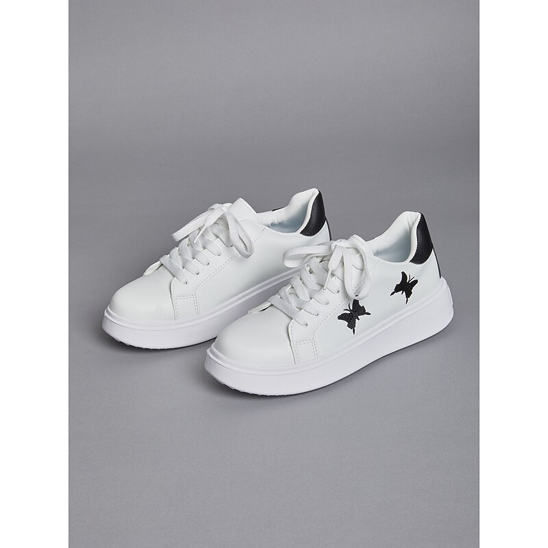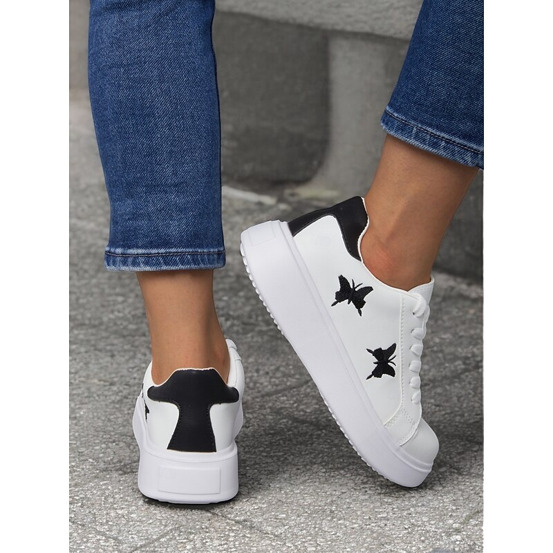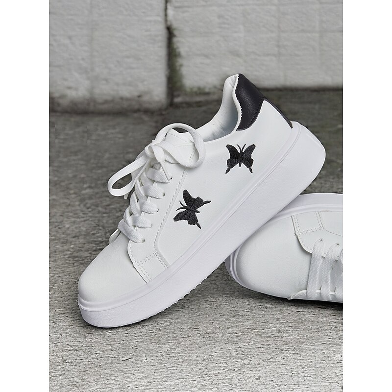 Highlights [Fabric & Construction] : These women's platform sneakers are crafted from high-quality faux leather, combining comfort with durability. The material ensures long-lasting wear, perfectly suited for daily activities. [Design & Style] : Featuring a clean white base, these sneakers showcase a unique black butterfly embroidery on the side, adding an element of charm and personal flair. The classic lace-up design ensures a secure and adjustable fit, while the black heel accent provides a subtle contrast. The sneakers have a round toe and a flat heel design, offering both comfort and style. [Key Design Features] : The sneakers come with a padded collar and tongue for extra comfort, making them ideal for day-long wear. The thick rubber outsole provides enhanced durability and excellent traction on various surfaces, making them a practical choice for different environments. [Occasions] : Perfect for everyday casual wear, these sneakers lend themselves well to a variety of settings, from a day out shopping to relaxed weekend outings. Their minimalistic yet stylish design makes them a versatile addition to any wardrobe. [Size Range] : Available in a range of sizes from US6 to US10.5, these sneakers cater to a wide array of foot sizes, ensuring a comfortable fit for everyone.