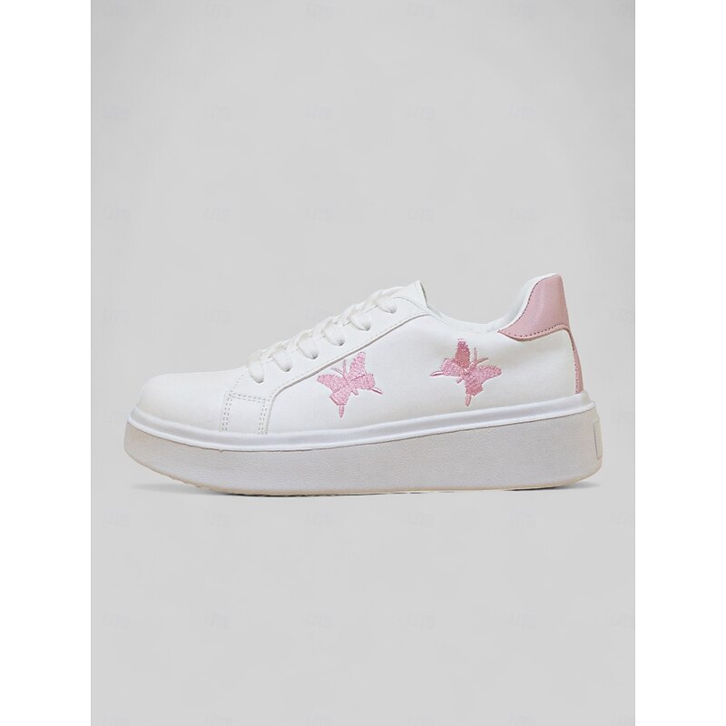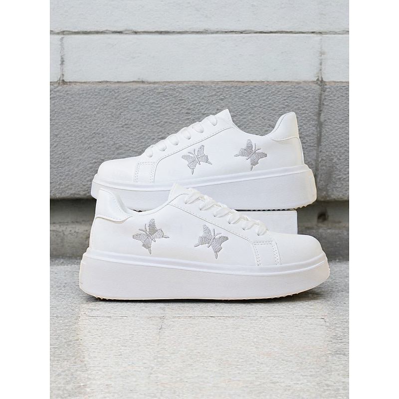 HOT ! Women's White Platform Sneakers with Butterfly Embroidery | Casual Lace-Up Shoes for Everyday Wear