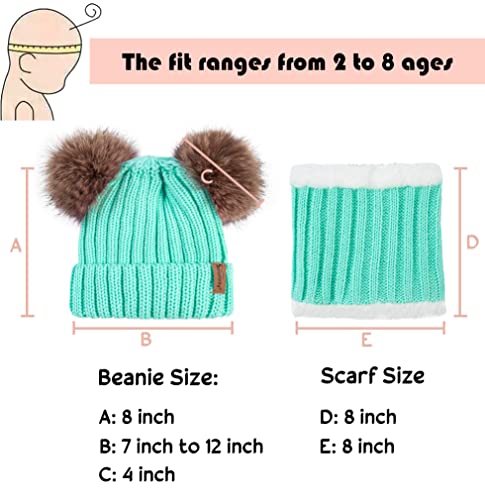 • Soft Stretchy Beanie and Scarf - This unisex style kids winter beanie scarf set with elastic size. The fit ranges from 2 to 8 ages. Beanie Size: Height: 8 inch, Width: 7 inch to 12 inch; Pom Size: 4 inch; Scarf Size: Height: 8 inch, Width: 8 inch