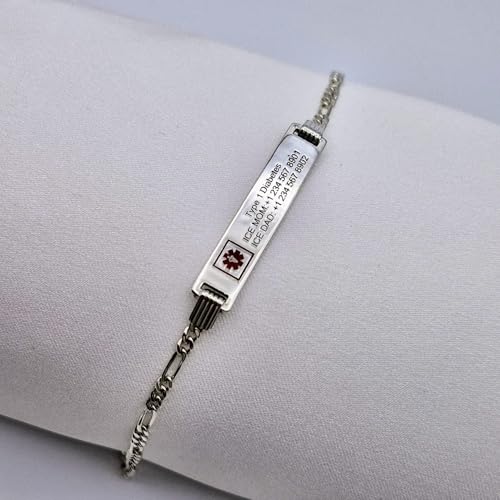 Customizable Ladies 925 Silver Sterling 3mm Figaro Medical ID Alert Bracelet with Free Engraving 1.57 x 0.39 inch Nameplate 5