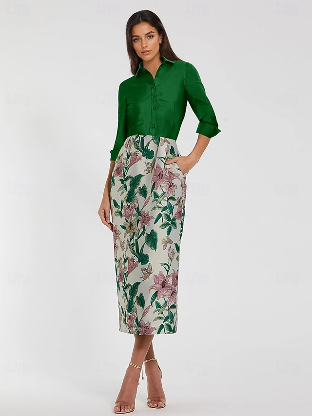 More information about Jacquard Brocade Floral Column Cocktail Dresses Elegant Dress Formal Wedding Ankle Length Long Sleeve Shirt Collar Nylon with Floral Print Wedding Guest Dress