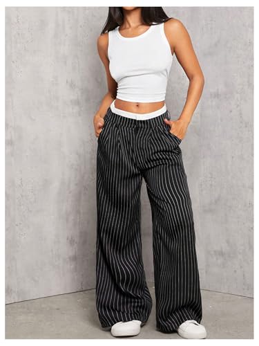 HOT ! MakeMeChic Women's Striped Pants Wide Leg Straight Suit Trousers with Pocket