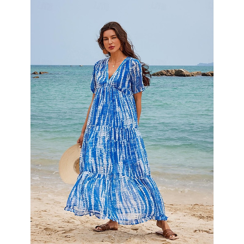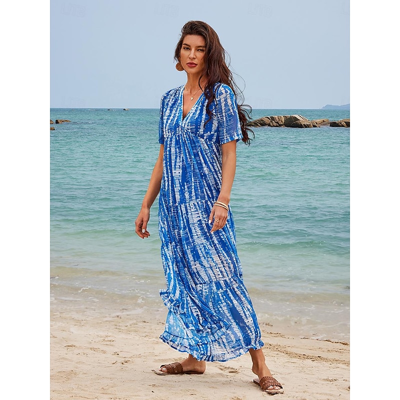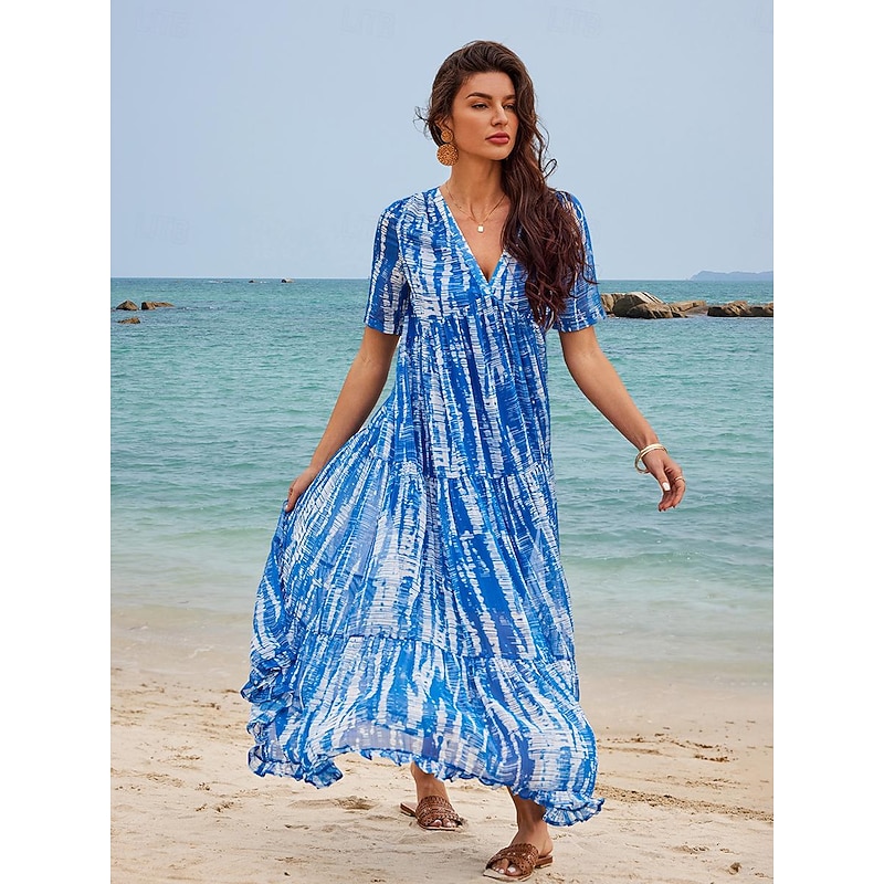 Highlights Women's Chiffon Casual Dress - Tie Dye V-Neck Maxi for Summer Women's Chiffon Casual Dress - Tie Dye V-Neck Maxi for Summer [Fabric] : This exquisite dress is crafted from lightweight and breathable chiffon fabric, perfect for keeping you comfortable on warm summer days. The material lends a soft, airy feel, ideal for a relaxed beach look. [Fit] : The dress features a loose and flowing silhouette, providing an effortlessly elegant drape and allowing for free movement. Its maxi length enhances the dress’s bohemian charm, making it a perfect fit for a casual and laid-back vibe. [Design Highlights] : Showcasing a vibrant blue and white tie-dye print, this dress adds a lively and artistic touch to your summer wardrobe. It features a flattering V-neckline and short sleeves, creating a stylish yet comfortable combination. The tiered skirt design further enhances its relaxed, beachy aesthetic. [Occasions] : Ideal for summer vacations, beach outings, holidays, and casual streetwear. Whether for a sunny day by the sea or a leisurely stroll through town, this versatile dress adds charm and style to any occasion. [Size Range] : Available in a wide size range from S to 2XL, ensuring a suitable fit for various body types.